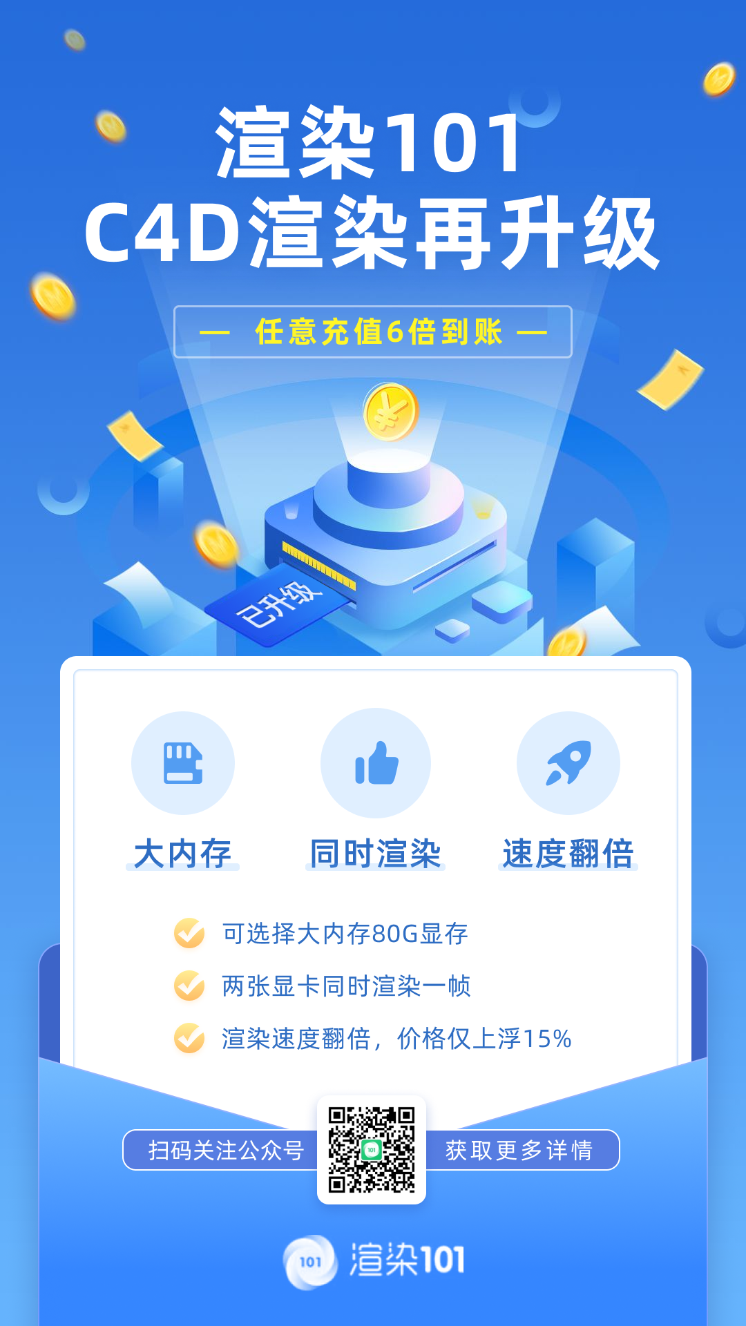 除此之外,双2080ti显卡同时渲染一帧,渲染速度进行了翻倍!根据渲染101余额充足的情况,而同时渲染的帧数机器多时,面对大内存渲染,速度可以是说极快!但价格仅仅只上涨百分之15每台机!
